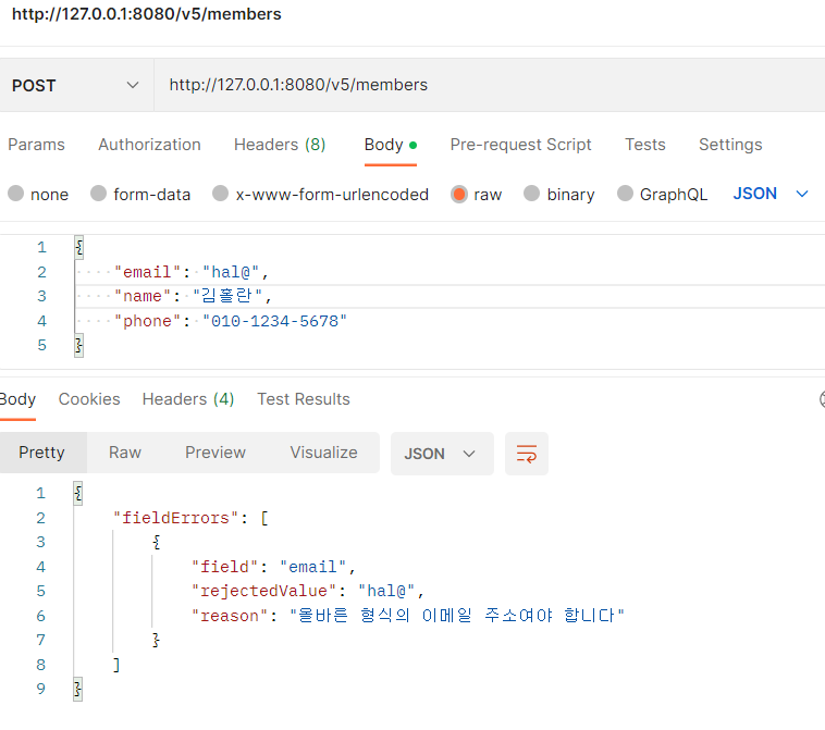 - e.getBindingResult().getFieldErrors()를 통해 발생한 에러 정보를 저장 (fieldErrors)