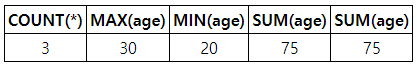- SELECT COUNT(*),MAX(age),MIN(age),SUM(age),SUM(age) FROM user;