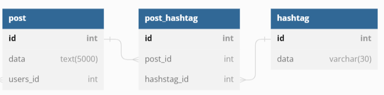 - post는 여러개의 hash태그를 가질수 있고, hash 태그는 여러개의 post를 가질수 있다.